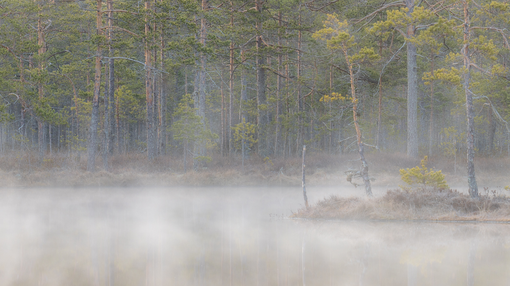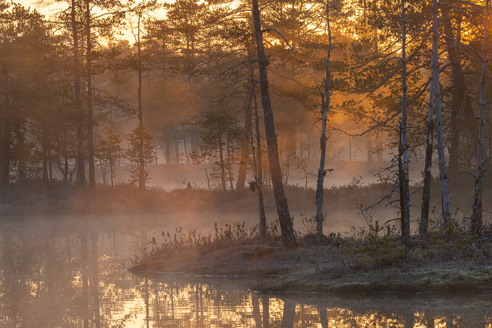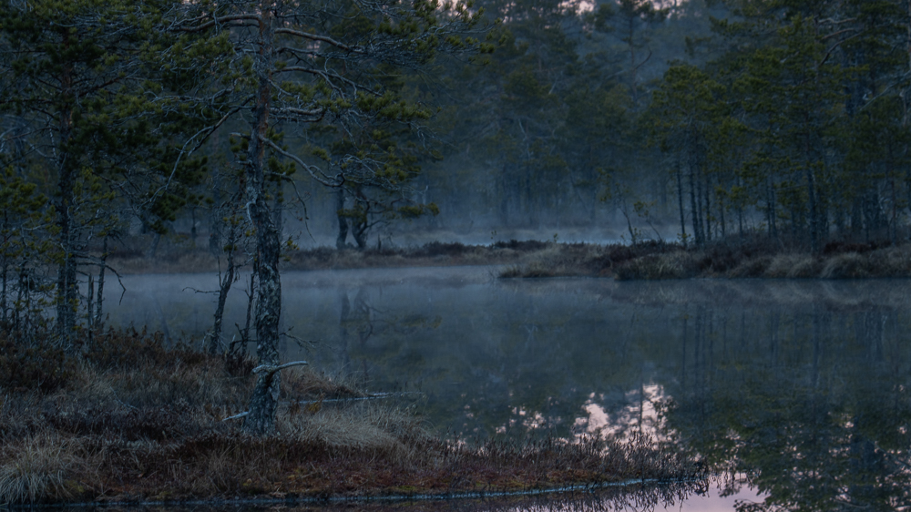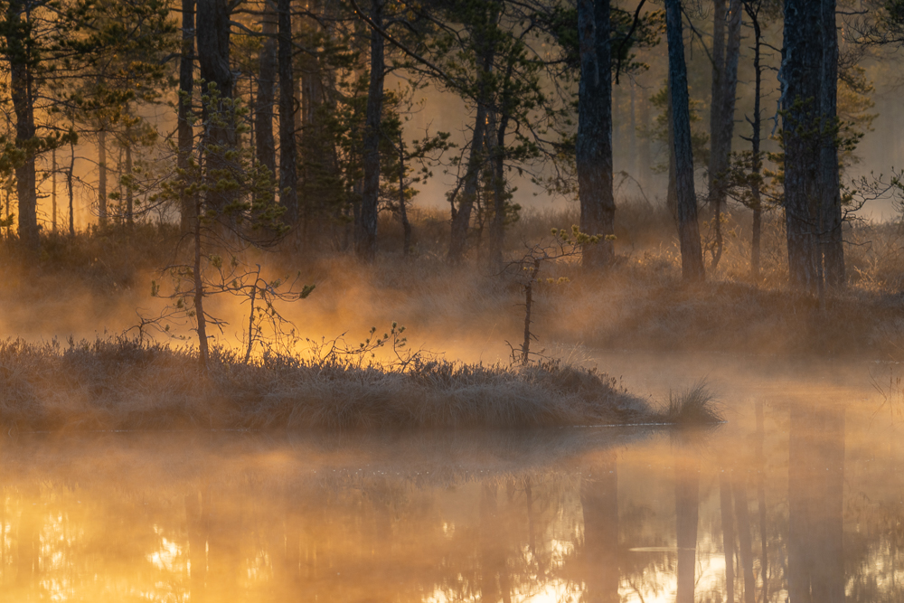 Det ljusnar så smått och himlen framför oss färgas rosa. Det är lite kyligt, men helt vindstilla och alla ljud blir märkligt stora. På den svarta gölens vatten bjuder dimmälvorna upp till dans och i bakgrunden hör vi smålomen ropa. Vi är 5 fotografer på workshop med Foto Magica och Mattias Sjölund, klockan är 4 på morgonen och vi står framför en av dom större gölarna vid Knuthöjdsmossen.