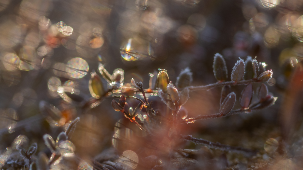 Strax efter soluppgången blev det märkbart kallare och marken täcktes av frost. Den gav självklart nya möjligheter till bilder, i synnerhet i kombination med ett guldfärgat motljus. På fötter som blev allt kallare fortsatte vi vår vandring på spången.