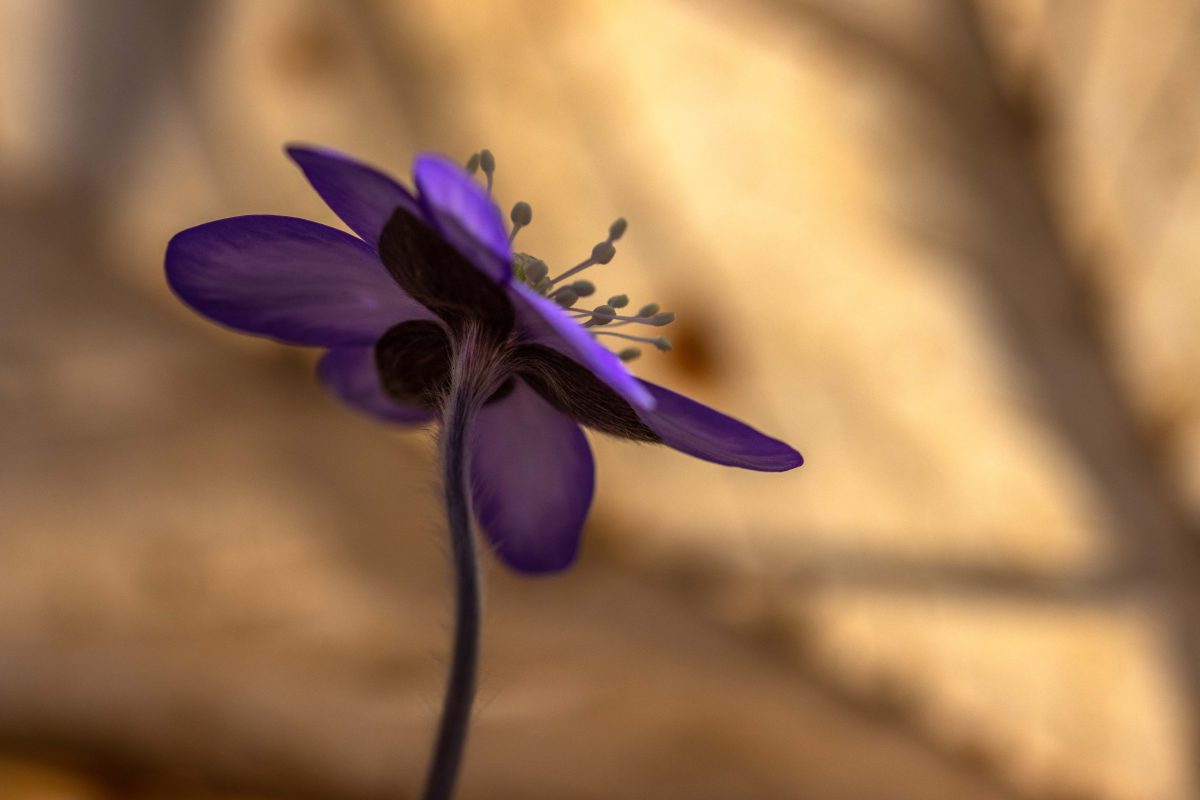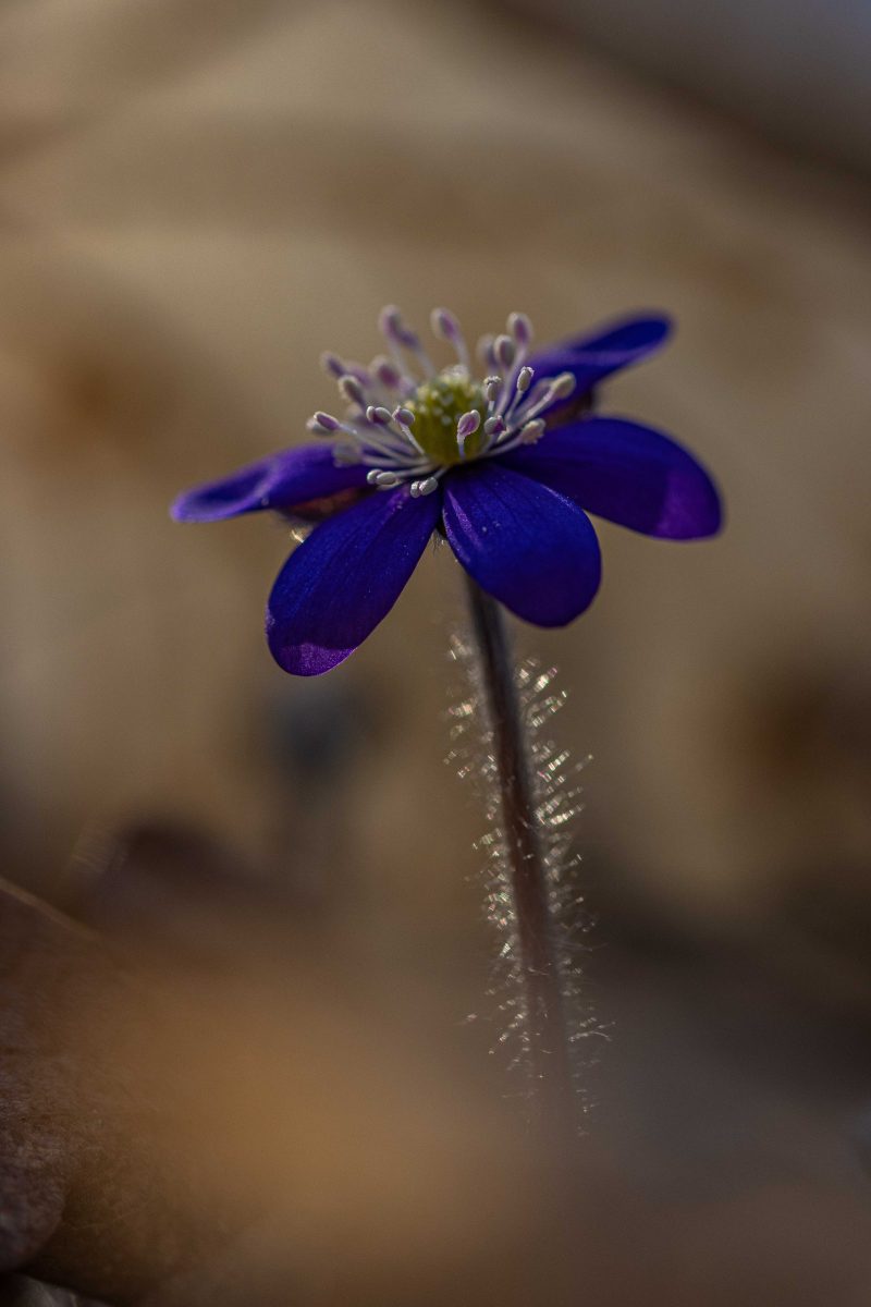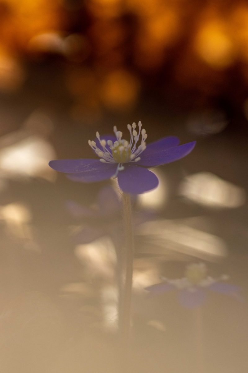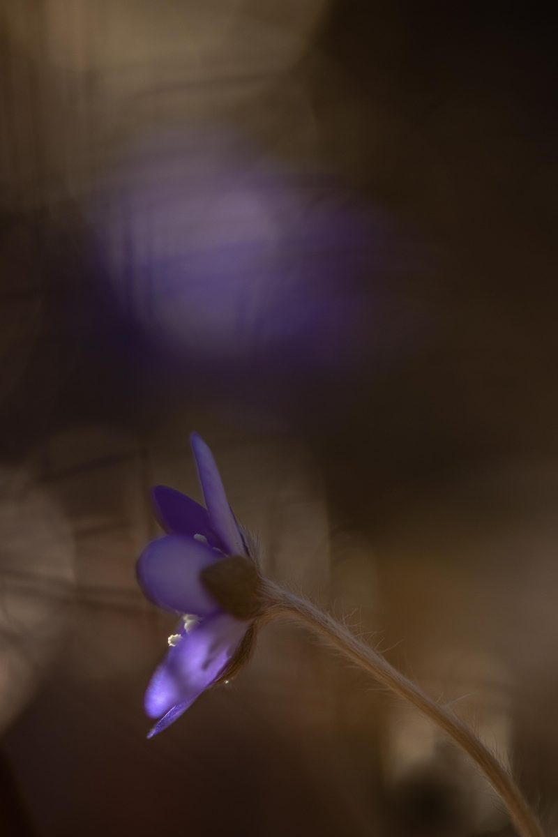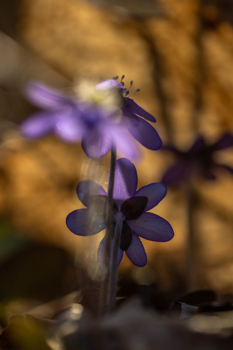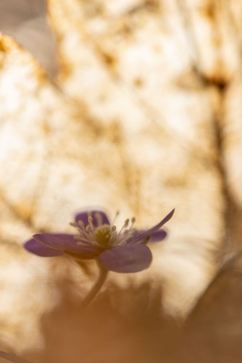 Solen stod högt på himlen och ljuset var skarpt och hårt. Det är inga bra förutsättningar för fotografering. Men blommorna var inbäddade skira brungula blad och torrt fjolårsgräs och när solstrålarna silades genom detta skapades mirakel. Ljuset blev mjukt och varmt runt blommorna och dom små ”rummen” blev som konstgallerier i mina ögon.