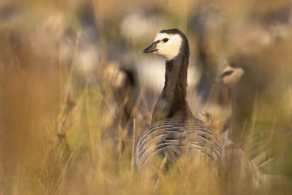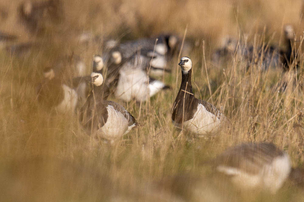 Dom betande gässen är väldigt uppmärksamma på vad som händer omkring dom och man måste vara mycket försiktig om man vill komma nära. Det är tydligt att vissa av flockmedlemmarna har i uppgift att hålla utkik så att övriga kan äta lite mer i lugn och ro. Jag kröp ner i det torra gräset för att dels se lite mindre hotfull ut, men också för att utnyttja gräset till en inramning av fåglarna. Jag tycker att det kan bli riktigt snyggt.