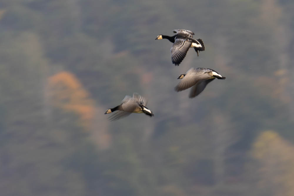 I början var justeringen inte så stor. Jag gjorde några försök att panorera och lyckades väl i alla fall något så när röra kameran i samma hastighet som fåglarna. Här är dom på väg att landa och jag tycker att deras tydliga svartvita fjäderdräkt blir en fin kontrast mot höstskogen i bakgrunden.