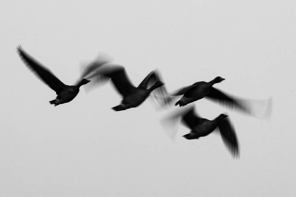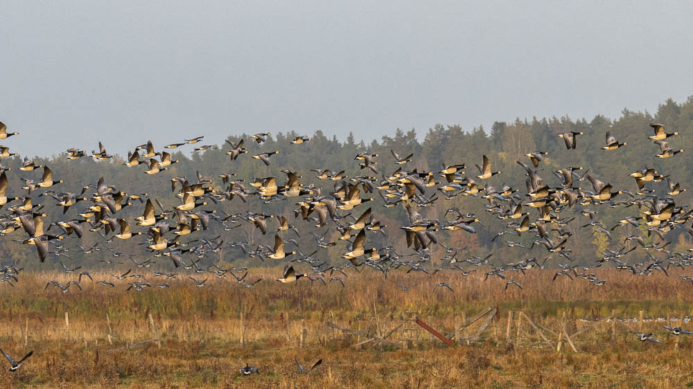 Rätt vad det är blir fåglarna skrämda och lyfter från marken. Kanske var det någon som såg en örn eller en räv eller så var det bara falskt alarm. Oavsett anledning blir det ”full panik” och ett väldigt väsen (om man vet hur en gås låter kanske man kan föreställa sig ljudet av 1000, 2000 eller 3000 samtidigt).