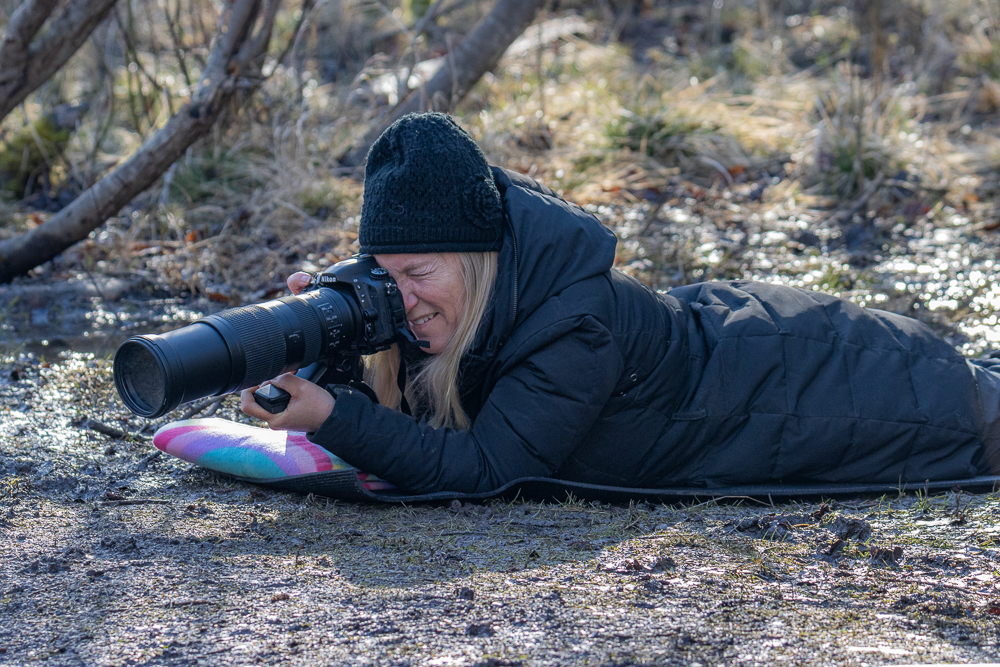 Jag hade precis hittat plockat upp kameran och tagit de första bilderna när Solbritt kom gående. Det var oerhört lerigt och blött runt hela dammen så att komma ner på grodornas nivå krävde antingen ett liggunderlag eller en rörlighet i ländrygg och fotleder för att komma djupt ner på huk. Jag hade tyvärr inget liggunderlag, men klarar att sitta på huk en stund i taget.