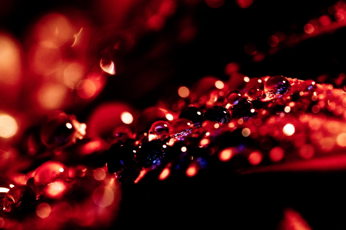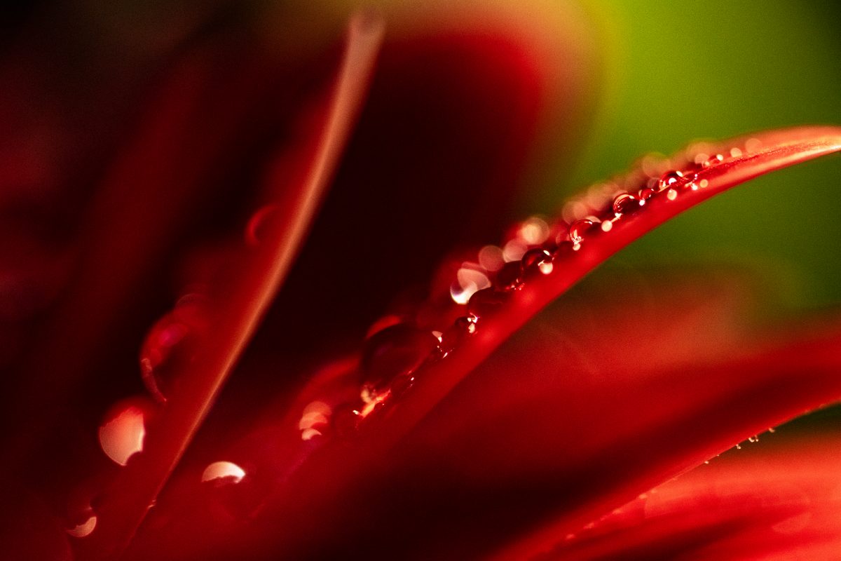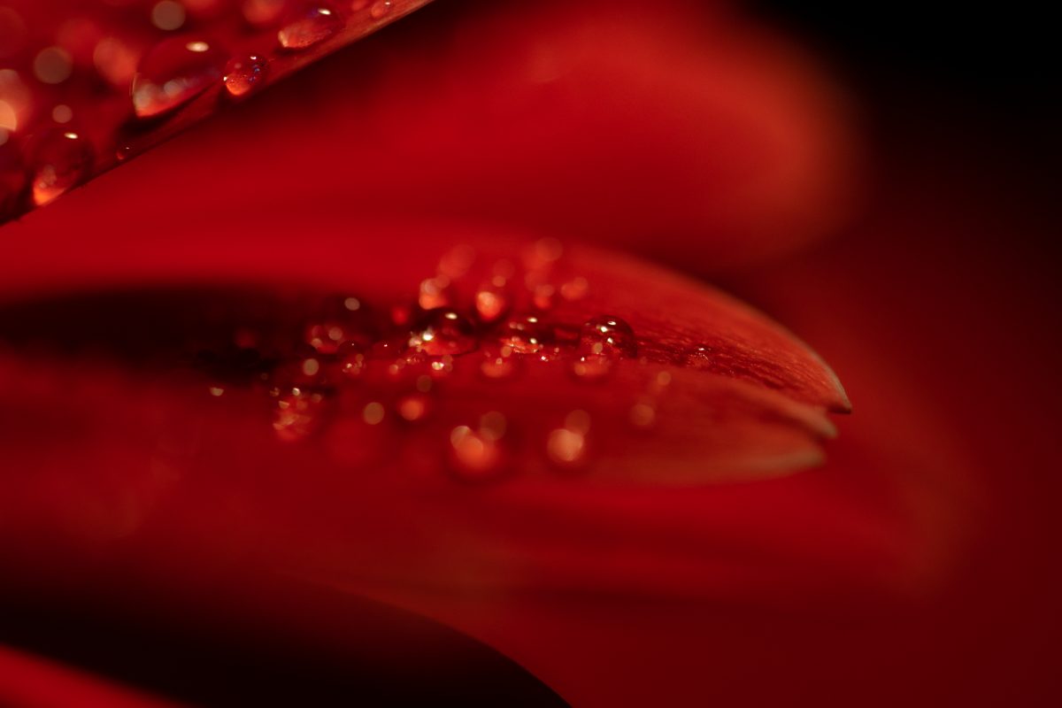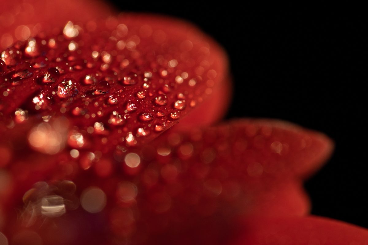 Det var först när jag började spraya vatten på en röd gerbera som jag kände att någonting hände. Plötsligt fick ljuset från lamporna en ”mening”, det gav dropparna liv. Själva blomman och dess blad blev mindre viktiga. Istället var det just ljuset och den effekt det hade på dropparna som var själva bilden.