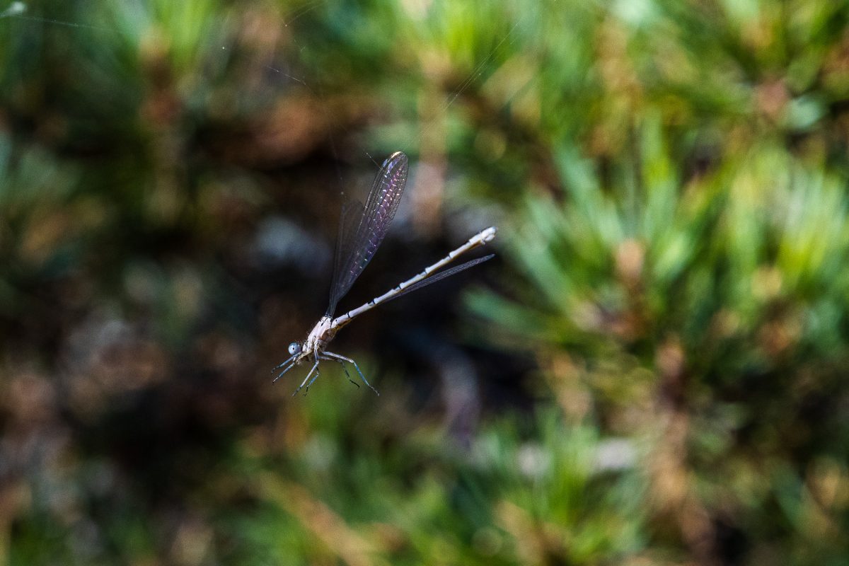 Jag har också fascinerats av sländorna; flicksländor, trollsländor och andra. Även dom är svåra att komma nära, men ibland har jag lyckats. Den första här hade haft oturen att fastna i ett spindelnät, men som tack för närbilden hjälpte jag den loss (och berövade förstås Fru spindel en middag)