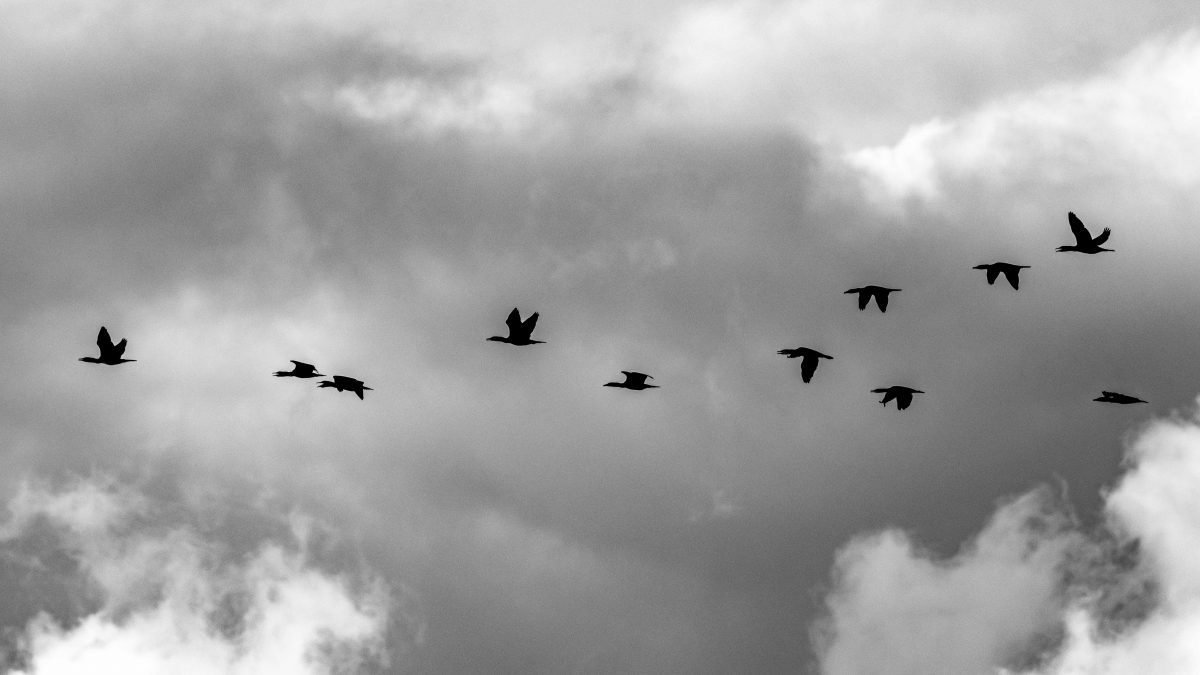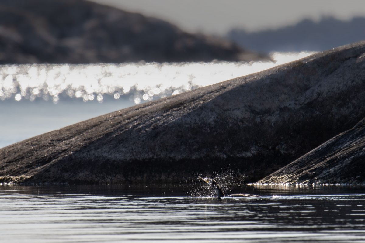 Förmiddagssolen glittrar i vattnet. Plötsligt bryts ytan av en skarv som skakar av sig vattnet.