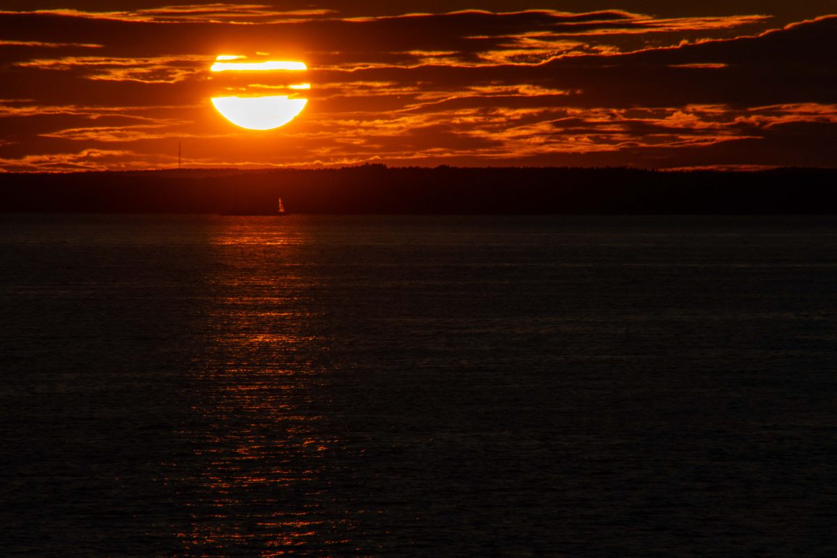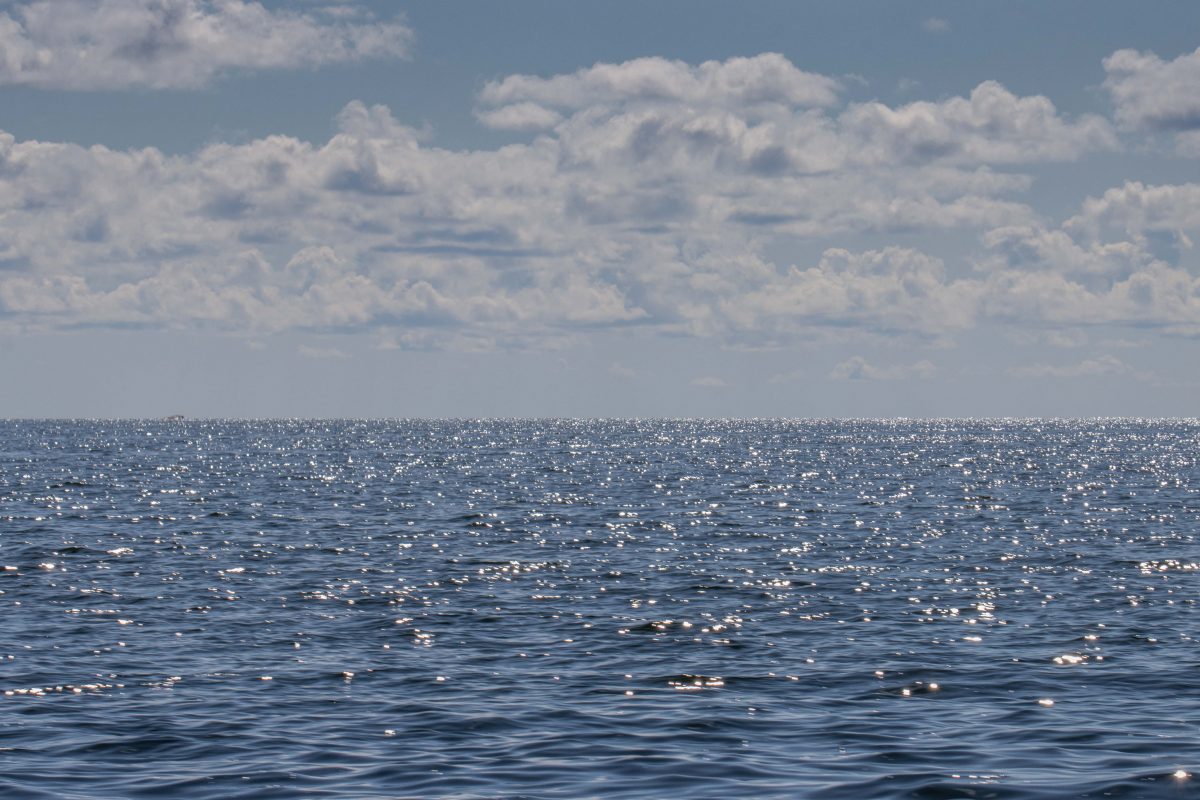 Jag har vaknat till spegelblankt hav och nästan fri horisont.